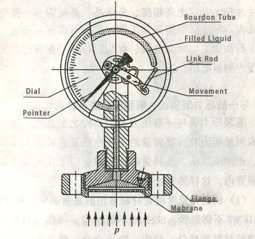 El elemento elástico del medidor de presión del diafragma es un tubo de resorte, mientras que el diafragma solo sirve como separador. El elemento elástico del medidor de diafragma de baja presión es un diafragma corrugado. La presión medida actúa sobre el diafragma, lo que hace que se someta a una deformación elástica hacia arriba (o hacia abajo). El valor de presión se indica a través del mecanismo de enlace soldado al diafragma.